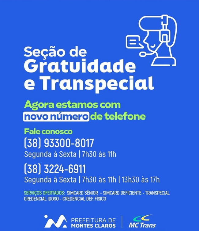 A MCTrans informa que a Seção de Gratuidade e Transpecial está com um novo número de telefone para atendimento ao público: (38) 93300-8017. Além desse, o setor continua atendendo pelo telefone (38) 3224-6911.